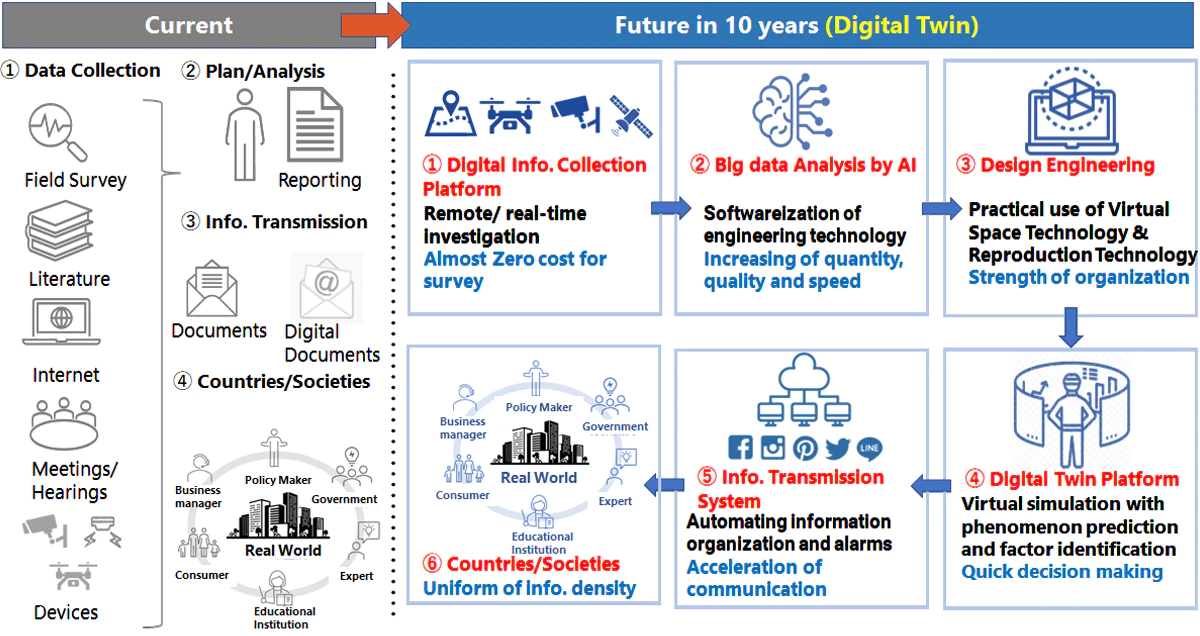 The above figure shows the digital twin of medium-term management plan. Nippon Koei has skilled experts in various fields, and if Nippon Koei has the comprehensive strength, we believe that we can cover all of the steps from upstream to downstream (1-6 above). This is the image of our organization in 10 years. In the future, I believe it will be necessary to create value that is different from the conventional thinking of construction consulting and to think about how to add value to technology.
