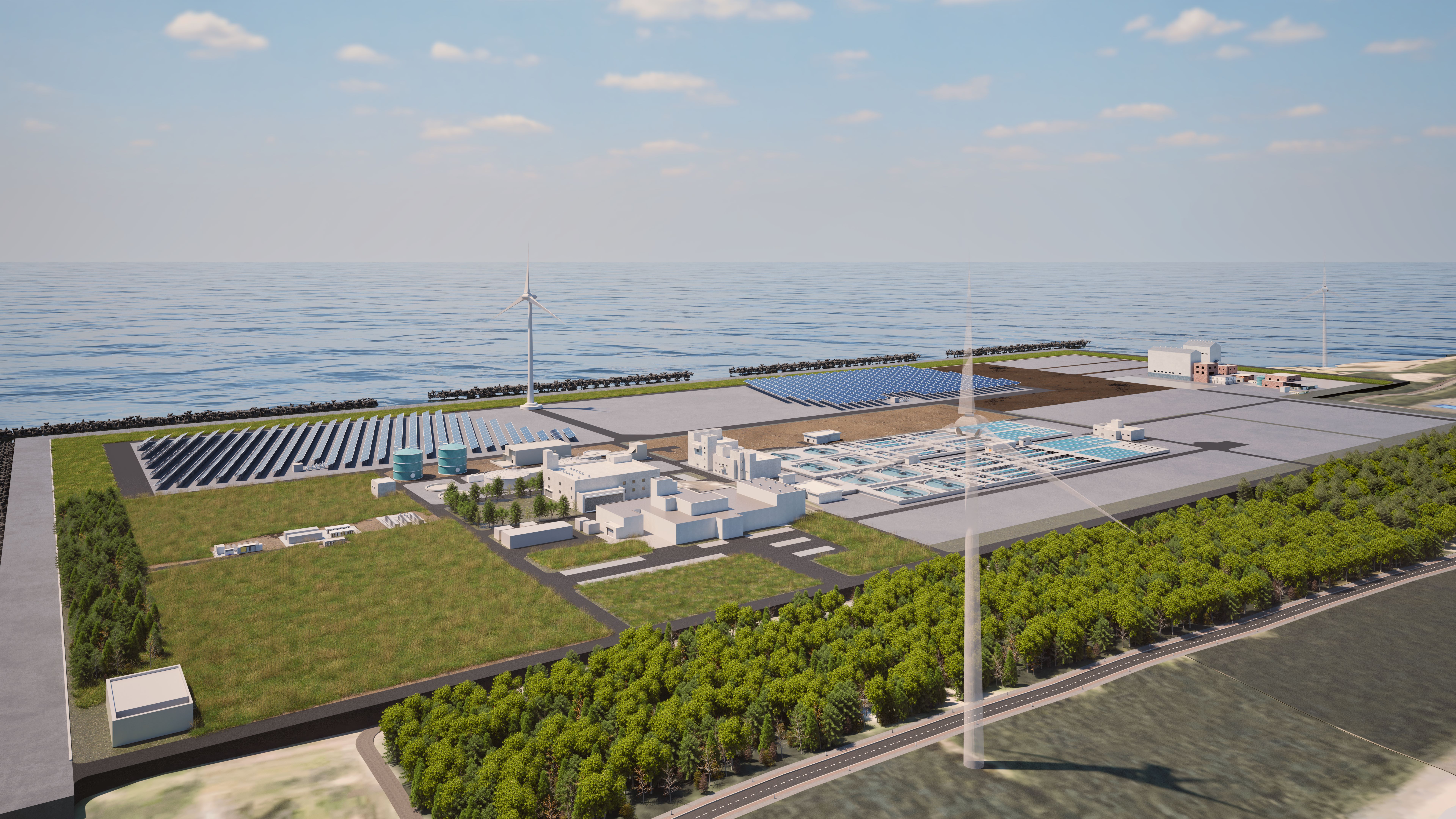 日本工営エナジーソリューションズが代表企業として推進する本事業は、下水処理場に再生可能エネルギー設備や蓄電池、マイクログリッドなどを導入し、公共施設へ地産地消電力を供給する取り組みです。地域の電力需要の大半を再エネで賄いCO₂排出ゼロを実現するとともに、停電時も電力供給を維持し、脱炭素と防災力向上に貢献します。