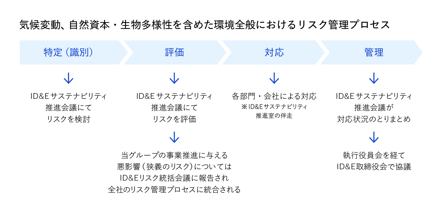 ID&Eグループは、環境課題への対応をサステナビリティ経営の中核と位置づけています。2025 年 2 月には東京海上グループの一員となり、グループ全体での連携と協働のもと、環境課題への対応を強化することとなりました。今後は、ID&E サステナビリティ推進会議の傘下に新設した「環境専門委員会」を中心に、自然資本· 生物多様性· 気候変動に関する対応をより一層強化していきます。