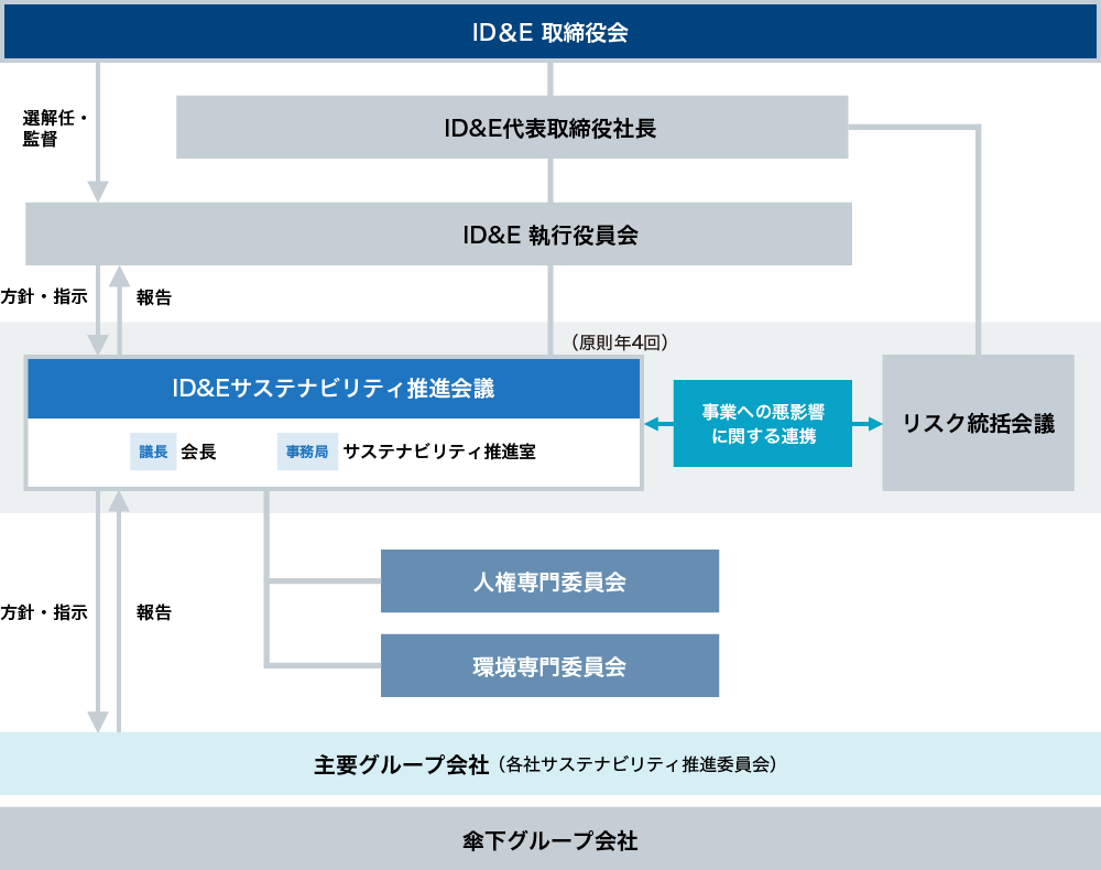 ID&Eグループは、持続可能な社会の発展への貢献と企業価値創造の両立を目指し、地球環境課題への取り組みをサステナビリティ経営における中核的な課題と捉えています。環境配慮に関する取り組みは、「グループ行動指針」「サステナビリティ基本方針」ならびに「サステナビリティ経営フレームワーク」の「環境活動方針」に基づいています。さらに、「環境活動方針」のもとに策定した各行動ガイドラインにて、環境に配慮した事業活動を促進しています。